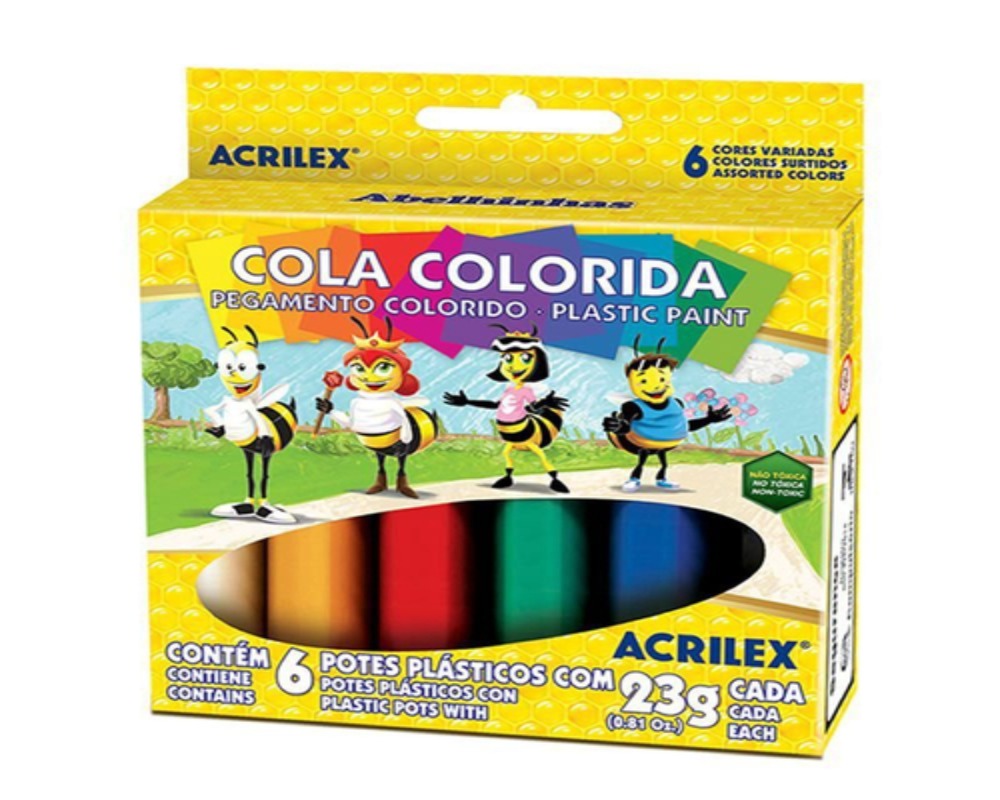 Decore ainda mais seus trabalhos A cola colorida foi desenvolvida para trabalhos escolares e artesanais. Ajuda no desenvolvimento artístico através de atividades e brincadeiras. Especificações Possui bico aplicador Material não tóxico Cores com brilho intenso. Ideal para Colagens Relevos coloridos decorações em geral Pintar sobre todos os tipos de papel Embalagem Contém 6 cores 23gr cada.